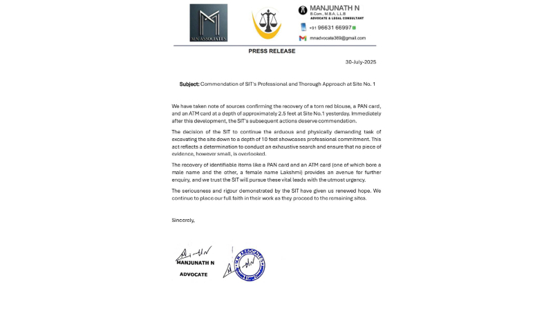 ಅಲ್ಲದೇ ಪಾಯಿಂಟ್-1ರಲ್ಲಿ ಪ್ಯಾನ್,ಡೆಬಿಟ್ ಕಾರ್ಡ್ ಜೊತೆಗೆ ಕೆಂಪು ರವಿಕೆ ಪತ್ತೆಯಾಗಿದೆ. ಲಕ್ಷ್ಮೀ ಎನ್ನುವ ಮಹಿಳೆಯ ಪ್ಯಾನ್ ಕಾರ್ಡ್ ಎಂದು ಅನನ್ಯ ತಾಯಿ ಸುಜಾತ ಭಟ್ ವಕೀಲರಿಂದ ಪತ್ರಿಕಾ ಪ್ರಕಟಣೆಯಲ್ಲಿ ತಿಳಿಸಿದ್ದಾರೆ. ತನಿಖಾ ಹಂತದಲ್ಲಿರುವಾಗಲೇ ವಕೀಲ ಮಂಜುನಾಥ್ ಈ ಬಗ್ಗೆ ಮಾಹಿತಿ ನೀಡಿದ್ದಾರೆ. ನಿನ್ನೆ ಪಾಯಿಂಟ್1ರ ಸ್ಥಳದಲ್ಲಿ ಲಕ್ಷ್ಮೀ ಎಂಬ ಮಹಿಳೆಯ ಪ್ಯಾನ್ ಕಾರ್ಡ್ ಪತ್ತೆಯಾಗಿದೆ. ಅಲ್ಲದೇ ಪುರುಷನ ಡೆಬಿಟ್ ಕಾರ್ಡ್ಗಳು ಪತ್ತೆಯಾಗಿವೆ ಎಂದು ಹೇಳಿಕೆ ನೀಡಿದ್ದಾರೆ. ಸದ್ಯ 20 ಕಾರ್ಮಿಕರಿಂದ ದೂರುದಾರನ ನಿರ್ದೇಶನದಂತೆ ಅಗೆಯೋ ಕಾರ್ಯಾಚರಣೆ ಮುಂದುವರಿದಿದೆ.