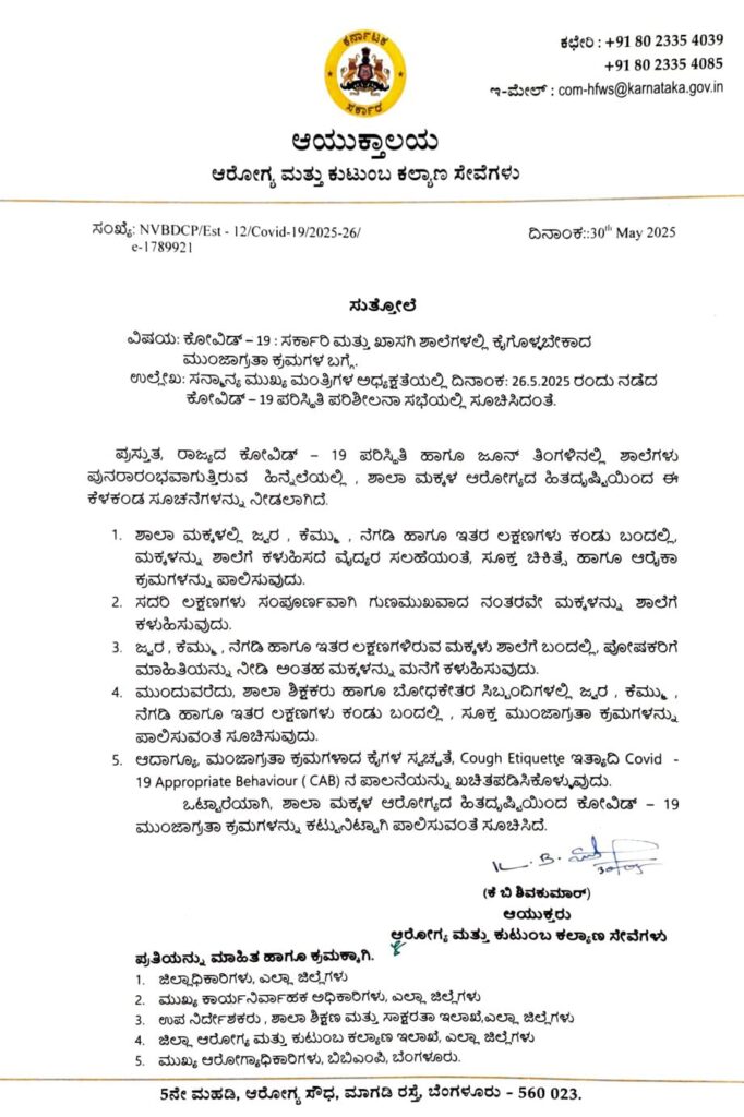 ರಾಜ್ಯದಲ್ಲಿ ಕೊರೋನಾ ಹೆಚ್ಚಳ ಹಿನ್ನೆಲೆಯಲ್ಲಿ ಸರ್ಕಾರಿ ಹಾಗೂ ಖಾಸಗಿ ಶಾಲಾ ಮಕ್ಕಳಿಗೆ ಆರೋಗ್ಯ ಇಲಾಖೆ ಆಯುಕ್ತ ಶಿವಕುಮಾರ್ ಅವರು ಹೊಸ ಗೈಡ್ ಲೈನ್ಸ್ ಪ್ರಕಟಿಸಿ ಆದೇಶ ಹೊರಡಿಸಿದ್ದಾರೆ.