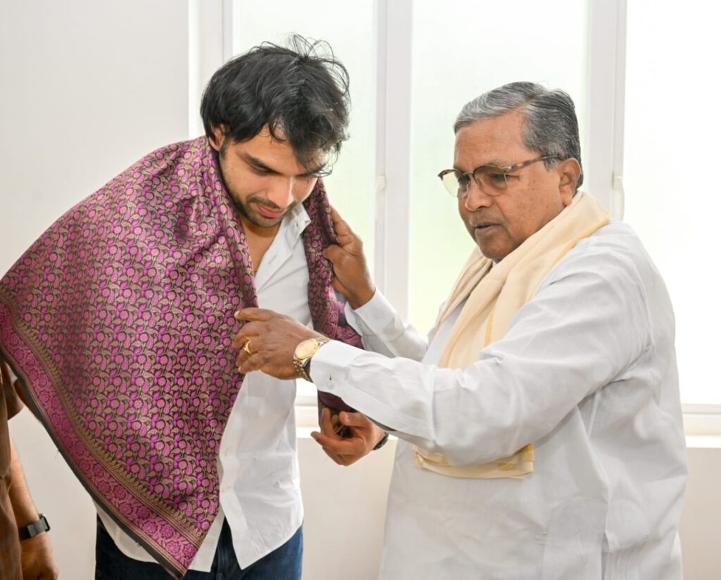 ಅವಳಿ ಒಲಿಂಪಿಕ್ಸ್ ಪದಕ ವಿಜೇತ, ಖ್ಯಾತ ಜಾವೆಲಿನ್ ಎಸೆತಗಾರ ನೀರಜ್ ಚೋಪ್ರಾ ಮುಖ್ಯಮಂತ್ರಿ ಸಿದ್ದರಾಮಯ್ಯ ಅವರನ್ನು ಕಾವೇರಿ ನಿವಾಸದಲ್ಲಿ ಇಂದು ಸೌಹಾರ್ದ ಭೇಟಿ ಮಾಡಿದರು. ಮುಖ್ಯಮಂತ್ರಿಗಳು ನೀರಜ್ ಚೋಪ್ರಾರನ್ನ ಹೂಗುಚ್ಛ ಕೊಟ್ಟು ಸನ್ಮಾನಿಸಿ, ಶುಭ ಹಾರೈಸಿದರು. ಬಳಿಕ ಕೆಲಕಾಲ ಅವರೊಂದಿಗೆ ಸಿಎಂ ಸಿದ್ದರಾಮಯ್ಯ ಸಮಾಲೋಚಿಸಿದರು.