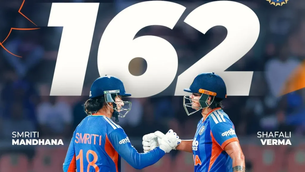 ಆರಂಭದಿಂದಲೂ ಅಬ್ಬರಿಸಿದ ಸ್ಮೃತಿ ಮಂಧಾನ ಹಾಗೂ ಶಫಾಲಿ ವರ್ಮಾ ಮೊದಲ ವಿಕೆಟ್ಗೆ ದಾಖಲೆಯ 162 ರನ್ಗಳ ಜೊತೆಯಾಟ ನೀಡಿದ್ದಾರೆ. ಇದು ಅಂತರರಾಷ್ಟ್ರೀಯ ಟಿ20 ಕ್ರಿಕೆಟ್ನಲ್ಲಿ ಭಾರತದ ಆರಂಭಿಕ ಜೋಡಿ ಮೊದಲ ವಿಕೆಟ್ಗೆ ಕಲೆಹಾಕಿದ ಅತ್ಯಧಿಕ ರನ್ಗಳ ಜೊತೆಯಾಟ ಕೂಡ ಆಗಿದೆ. ಸ್ಮೃತಿ ಮಂಧಾನ ಹಾಗೂ ಶಫಾಲಿ ವರ್ಮಾ ಅತ್ಯದ್ಭುತ ಪ್ರದರ್ಶನ ನೀಡುವ ಮೂಲಕ ಹೊಸ ದಾಖಲೆ ಬರೆದಿದ್ದಾರೆ.