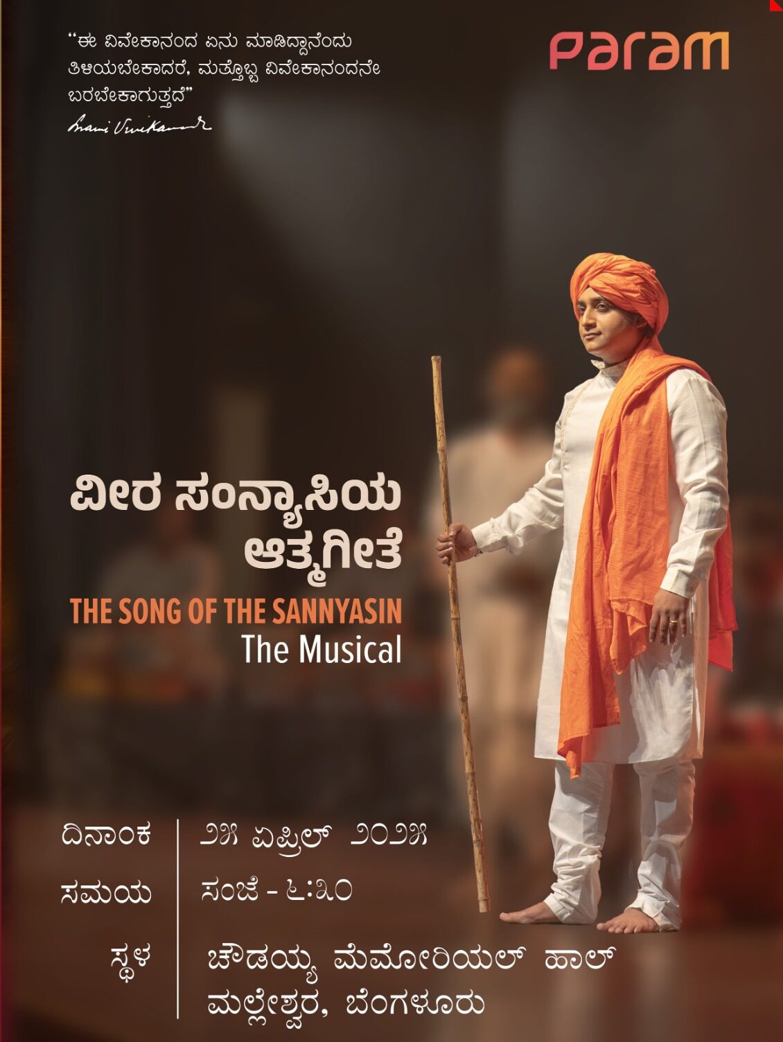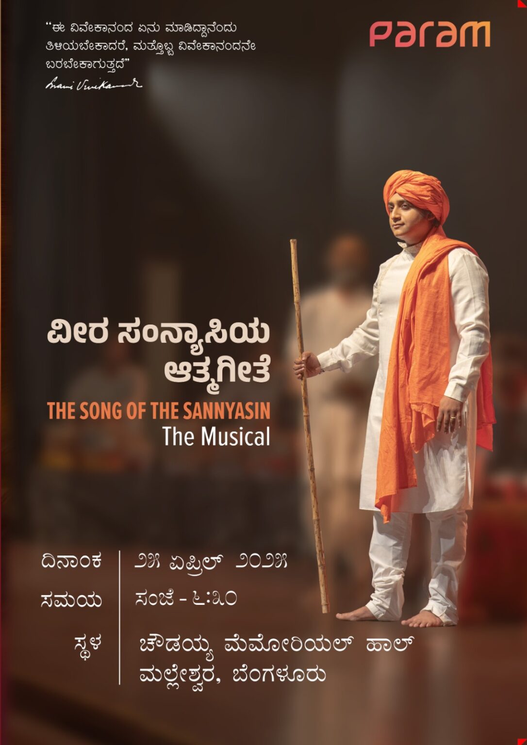 ಸ್ವಾಮಿ ವಿವೇಕಾನಂದರ(Swami Vivekananda) ಜೀವನ ಕುರಿತ ವೀರ ಸಂನ್ಯಾಸಿಯ ಆತ್ಮಗೀತೆಯು (The Song of the Sannyasin) ಮತ್ತೊಮ್ಮೆ ನಿಮ್ಮ ಮುಂದೆ ಪ್ರದರ್ಶನಕ್ಕೆ ಸಜ್ಜಾಗಿದೆ.. ಏಪ್ರಿಲ್ 25ಕ್ಕೆ ಸಂಜೆ 6.30ಕ್ಕೆ ಬೆಂಗಳೂರಿನ ಮಲ್ಲೆಶ್ವರಂನ ಚೌಡಯ್ಯ ಹಾಲ್ನಲ್ಲಿ ಪರಮ್ ಕಲ್ಚರ್ ಅರ್ಪಿಸುತ್ತಿರುವ ವೀರ ಸಂನ್ಯಾಸಿಯ ಆತ್ಮಗೀತೆ ಪ್ರದರ್ಶನಗೊಳ್ಳಲಿದೆ. ಇದು ಸಂಗೀತ, ನೃತ್ಯ, ನಾಟಕಗಳ ಮೂಲಕ ಸ್ವಾಮಿ ವಿವೇಕಾನಂದರ ಜೀವನ – ಚಿಂತನೆಗಳನ್ನ ವಿಜೃಂಭಣಾತ್ಮಕವಾಗಿ ತೋರಿಸುವ ಒಟ್ಟು 2 ಗಂಟೆಗಳ ಕಾಲಾವಧಿಯ ಪ್ರದರ್ಶನವಾಗಿದೆ. ಸುಮಾರು 35ಕ್ಕೂ ಹೆಚ್ಚು ಅಂತಾರಾಷ್ಟ್ರೀಯ ಖ್ಯಾತಿಯ ಕಲಾವಿದರು ಭಾಗವಹಿಸಲಿದ್ದಾರೆ..
